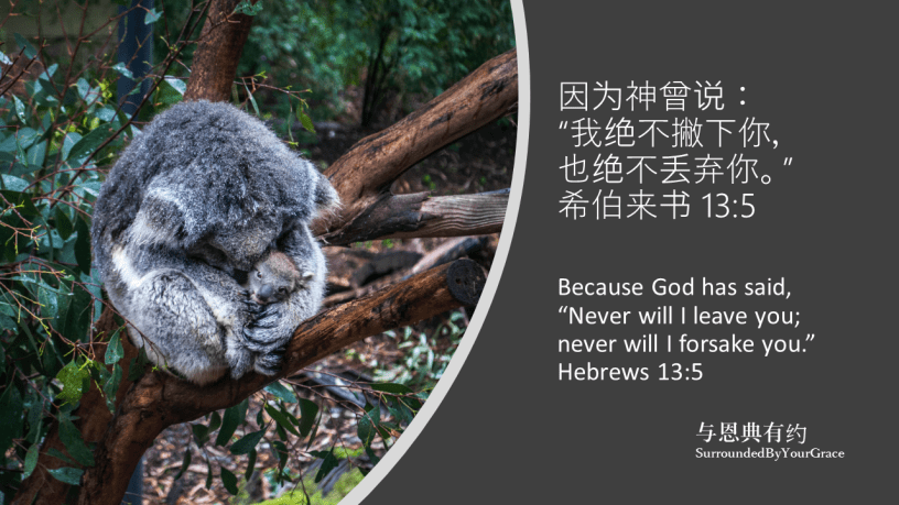 希伯来书, 应许 希伯来书 13:5 Date: 12/26/2020Author: Surrounded By Your Grace 0 Comments 因为神曾说:“我绝不撇下你,也绝不丢弃你。” 希伯来书 13:5 Because God has said, “Never will I leave you; never will I forsake you.” Hebrews 13:5 Share this: Share on X (Opens in new window) X Share on Facebook (Opens in new window) Facebook Share on Pinterest (Opens in new window) Pinterest Share on WhatsApp (Opens in new window) WhatsApp Share on Telegram (Opens in new window) Telegram Like Loading... Related