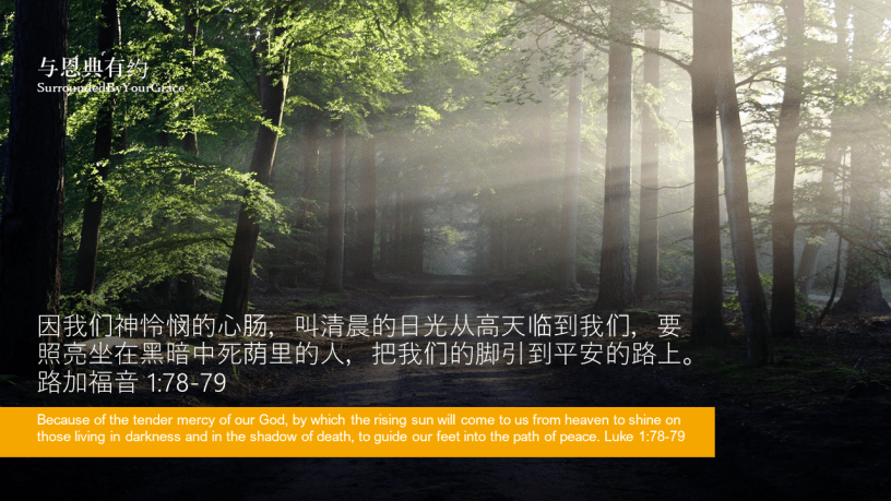 因我们神怜悯的心肠,叫清晨的日光从高天临到我们,要照亮坐在黑暗中死荫里的人,把我们的脚引到平安的路上。路加福音 1:78-79