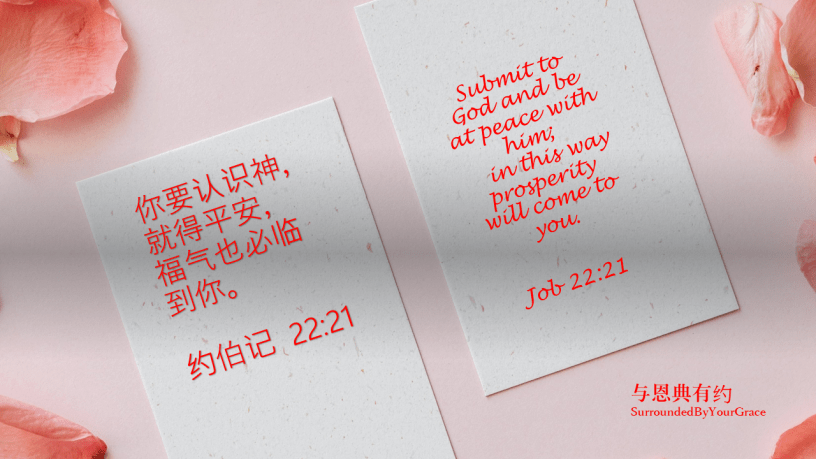 约伯记, 应许 约伯记 22:21 Date: 12/27/2020Author: Surrounded By Your Grace 0 Comments Submit to God and be at peace with him; in this way prosperity will come to you. Job 22:21 你要认识神,就得平安,福气也必临到你。约伯记 22:21 Share this: Share on X (Opens in new window) X Share on Facebook (Opens in new window) Facebook Share on Pinterest (Opens in new window) Pinterest Share on WhatsApp (Opens in new window) WhatsApp Share on Telegram (Opens in new window) Telegram Like Loading... Related