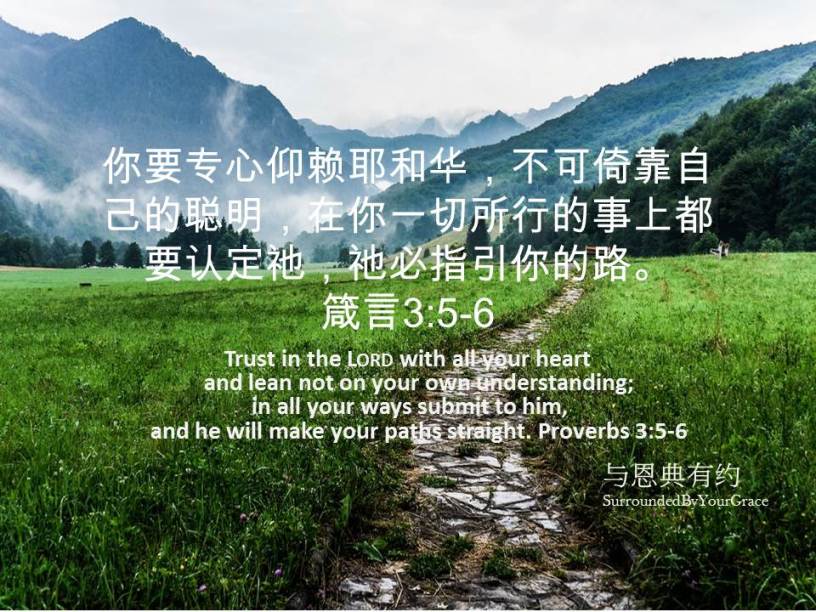 箴言, 帮助, 仰望, 依靠 箴言3:5-6 Date: 01/12/2021Author: tingfong123 0 Comments 你要专心仰赖耶和华,不可倚靠自己的聪明,在你一切所行的事上都要认定祂,祂必指引你的路。箴言3:5-6 Trust in the Lord with all your heart and lean not on your own understanding; in all your ways submit to him, and he will make your paths straight. Proverbs 3:5-6 Share this: Share on X (Opens in new window) X Share on Facebook (Opens in new window) Facebook Share on Pinterest (Opens in new window) Pinterest Share on WhatsApp (Opens in new window) WhatsApp Share on Telegram (Opens in new window) Telegram Like Loading... Related