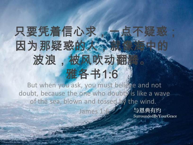 只要凭着信心求,一点不疑惑;因为那疑惑的人,就像海中的波浪,被风吹动翻腾。雅各书1:6