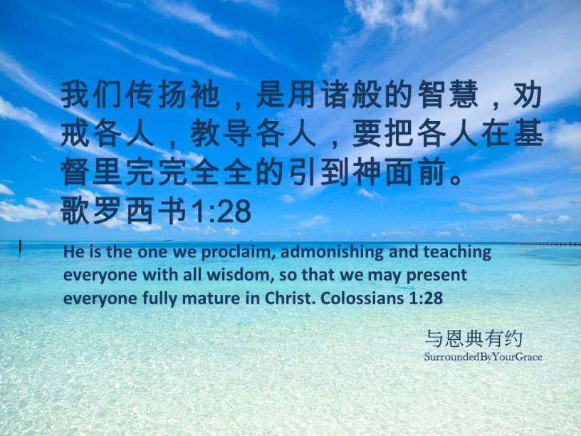 我们传扬衪,是用诸般的智慧,劝戒各人,教导各人,要把各人在基督里完完全全的引到神面前。歌罗西书1:28