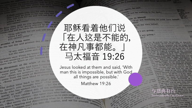 马太福音, 平安, 保护 马太福音 19:26 Date: 02/21/2021Author: Surrounded By Your Grace 主啊!求主的保护临到我们,叫所有疫苗都有良好果效,无论那一款都对预防病毒能够发挥应有的作用,叫一切副作用远离我们,消化如蜡,全然后退!因为主要作王!感谢主,奉主耶稣基督得胜名求,阿们。 耶稣看着他们说:「在人这是不能的,在神凡事都能。」马太福音 19:26 Jesus looked at them and said, ‘With man this is impossible, but with God all things are possible.’ Matthew 19:26 Share this: Share on X (Opens in new window) X Share on Facebook (Opens in new window) Facebook Share on Pinterest (Opens in new window) Pinterest Share on WhatsApp (Opens in new window) WhatsApp Share on Telegram (Opens in new window) Telegram Like Loading... Related