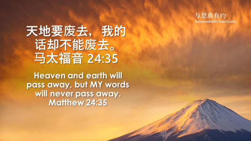 马太福音, 圣经, 应许, 律法 马太福音 24:35 Date: 02/24/2021Author: Surrounded By Your Grace 天地要废去,我的话却不能废去。马太福音 24:35 Heaven and earth will pass away, but MY words will never pass away. Matthew 24:35 主啊,天地都是借你的命而立,你的话带有能力带有应许,并且永远长存。求主帮助我学习你的话,把你的话刻在心板上,不会忘记你的训词,一心遵守。感谢主,奉主耶稣基督胜名求,阿们。 Share this: Share on X (Opens in new window) X Share on Facebook (Opens in new window) Facebook Share on Pinterest (Opens in new window) Pinterest Share on WhatsApp (Opens in new window) WhatsApp Share on Telegram (Opens in new window) Telegram Like Loading... Related