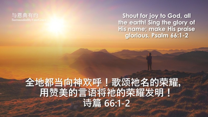 荣耀, 行为, 诗篇, 赞美, 拯救, 依靠, 保护, 信心 诗篇 66:1-2 Date: 03/31/2021Author: tingfong123 全地都当向神欢呼!歌颂他名的荣耀!用赞美的言语将他的荣耀发明!诗篇 66:1-2 Shout for joy to God, all the earth!Sing the glory of his name; make his praise glorious. Psalm 66:1-2 亲爱天父,感谢祢赐下救恩,让主耶稣替我们付上赎价,让信主名的人都得着永生。主呀,我们能够尝到这主恩,真是有福! 来让我们向祢欢呼,歌颂祢的名! 感谢祢听我们的祈祷。祷告奉主耶稣基督胜名求,阿们。 Share this: Share on X (Opens in new window) X Share on Facebook (Opens in new window) Facebook Share on Pinterest (Opens in new window) Pinterest Share on WhatsApp (Opens in new window) WhatsApp Share on Telegram (Opens in new window) Telegram Like Loading... Related