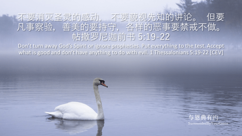 不要消灭圣灵的感动, 不要藐视先知的讲论。 但要凡事察验,善美的要持守,各样的恶事要禁戒不做。 帖撒罗尼迦前书 5:19-22