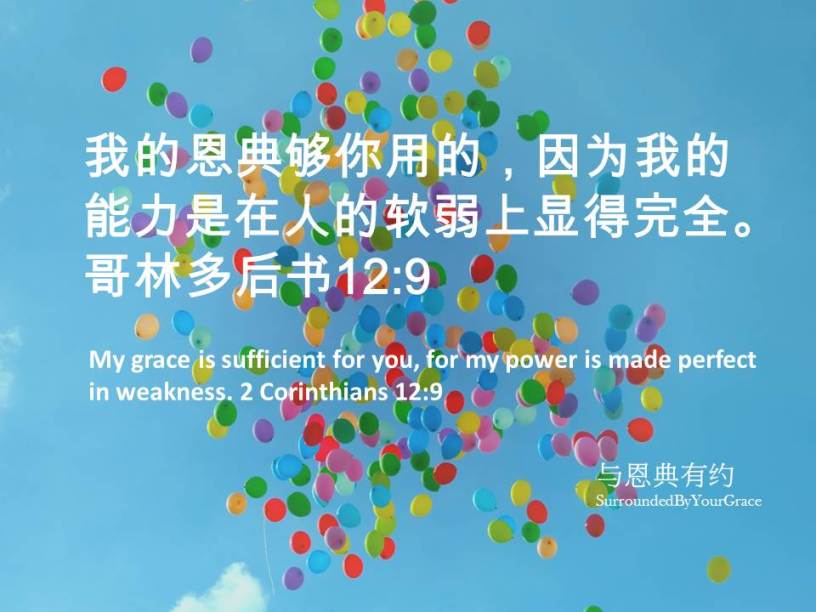 哥林多后书, 恩典 哥林多后书12:9 Date: 06/27/2021Author: tingfong123 我的恩典够你用的,因为我的能力是在人的软弱上显得完全。哥林多后书12:9 My grace is sufficient for you, for my power is made perfect in weakness. 2 Corinthians 12:9 亲爱天父,我们常常忧虑,担心工作,担心家庭,也担心教会。但主祢却说祢的恩典够我们用,主呀,我们要常常连结于祢,在祢那里支取能力,叫我们的软弱,在祢那里成为刚强,好叫祢的能力覆庇我。感谢祢听我们的祈祷,祷告奉主耶稣基督胜名求,阿们。 Share this: Share on X (Opens in new window) X Share on Facebook (Opens in new window) Facebook Share on Pinterest (Opens in new window) Pinterest Share on WhatsApp (Opens in new window) WhatsApp Share on Telegram (Opens in new window) Telegram Like Loading... Related