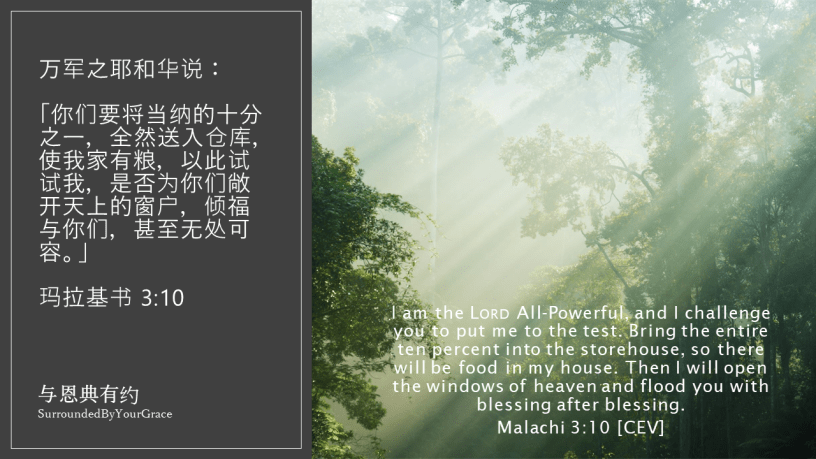 万军之耶和华说:「你们要将当纳的十分之一,全然送入仓库,使我家有粮,以此试试我,是否为你们敞开天上的窗户,倾福于你们,甚至无处可容。」 玛拉基书 3:10