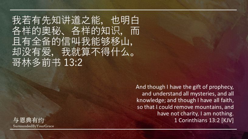 我若有先知讲道之能,也明白各样的奥秘、各样的知识,而且有全备的信叫我能够移山,却没有爱,我就算不得什么。哥林多前书 13:2