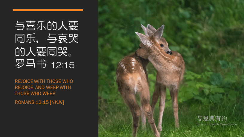 罗马书, 谦卑, 安慰, 帮助, 感动 罗马书 12:15 Date: 10/31/2021Author: tingfong123 与喜乐的人要同乐,与哀哭的人要同哭。罗马书 12:15 Rejoice with those who rejoice, and weep with those who weep. Romans 12:15 [NKJV] 亲爱天父,祢吩咐我们要与喜乐的人要同乐,与哀哭的人要同哭,求主赐我们一个怜悯别人的心,成为别人的安慰,因为当我们在患难的时候,主祢就安慰我们,叫我们能用主祢所赐的安慰去安慰那遭各样患难的人,求主叫我们都能成为体贴别人的人。感谢祢听我们的祈祷,祷告奉主耶稣基督胜名求,阿们。 Share this: Share on X (Opens in new window) X Share on Facebook (Opens in new window) Facebook Share on Pinterest (Opens in new window) Pinterest Share on WhatsApp (Opens in new window) WhatsApp Share on Telegram (Opens in new window) Telegram Like Loading... Related