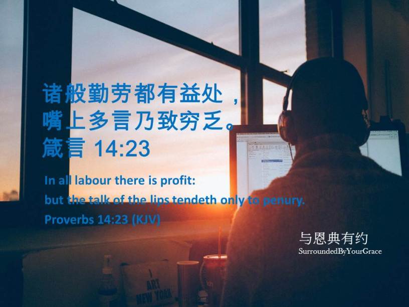 箴言, 行为, 智慧 箴言 14:23 Date: 11/14/2021Author: tingfong123 诸般勤劳都有益处,嘴上多言乃致穷乏。箴言 14:23 In all labour there is profit: but the talk of the lips tendeth only to penury. Proverbs 14:23 (KJV) 亲爱天父,祢吩咐我们要勤力做事,当我们做事的时候,都要从心里做,像是给主做的,不是给人做的,因我们知道从主那里必得着赏赐;我们所事奉的乃是主基督。我们手所做的工,求主坚立!感谢祢听我们的祈祷,祷告奉主耶稣基督胜名求,阿们。 Share this: Share on X (Opens in new window) X Share on Facebook (Opens in new window) Facebook Share on Pinterest (Opens in new window) Pinterest Share on WhatsApp (Opens in new window) WhatsApp Share on Telegram (Opens in new window) Telegram Like Loading... Related
