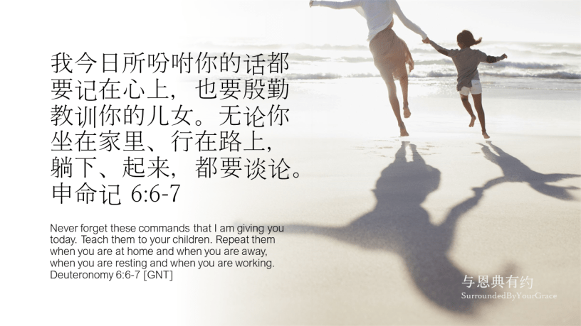 我今日所吩咐你的话都要记在心上, 也要殷勤教训你的儿女。无论你坐在家里、行在路上,躺下、起来,都要谈论。申命记 6:6-7