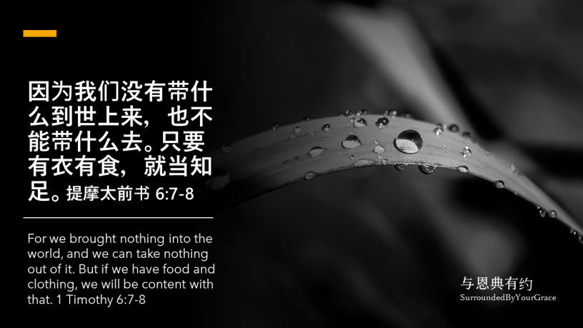 因为我们没有带什么到世上来,也不能带什么去。只要有衣有食,就当知足。提摩太前书 6:7-8