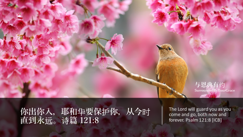 诗篇, 保护 诗篇 121:8 Date: 02/01/2022Author: tingfong123 你出你入,耶和华要保护你,从今时直到永远。诗篇 121:8 The Lord will guard you as you come and go, both now and forever. Psalm 121:8 [ICB] 亲爱主,感谢主在疫情中保守我们,我们深知道保护我们的是耶和华神,祢常在我们的右边荫庇我们。求主帮助我们在新一年仰望祢,赐我们有能力面对各样境况,并靠祢站立得稳。感谢祢听我们的祈祷,祷告奉主耶稣基督胜名求,阿们。 Share this: Share on X (Opens in new window) X Share on Facebook (Opens in new window) Facebook Share on Pinterest (Opens in new window) Pinterest Share on WhatsApp (Opens in new window) WhatsApp Share on Telegram (Opens in new window) Telegram Like Loading... Related