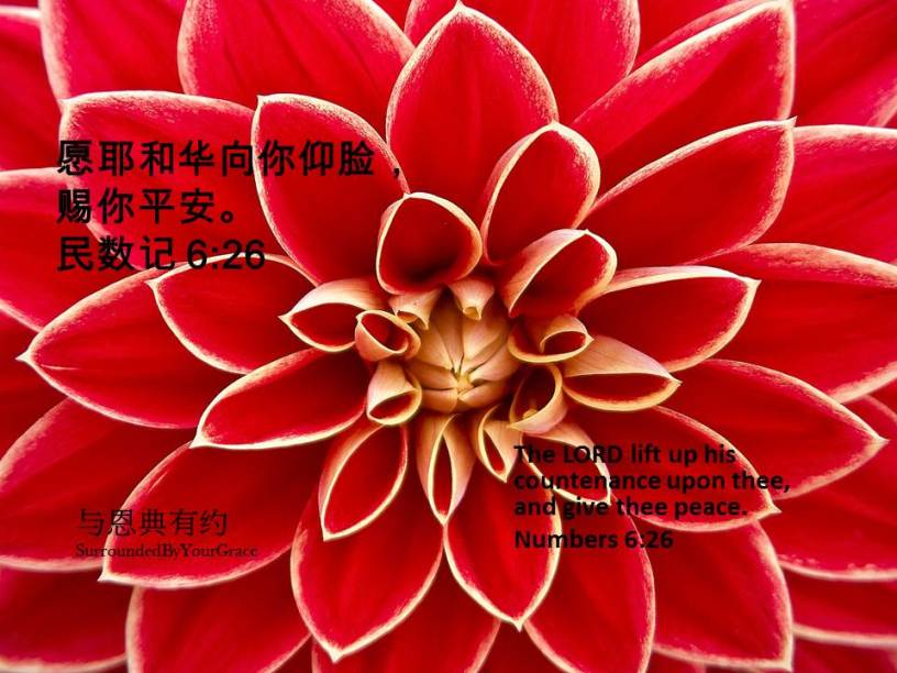 平安, 民数记 民数记 6:26 Date: 02/01/2022Author: tingfong123 愿耶和华向你仰脸,赐你平安。民数记 6:26 The LORD lift up his countenance upon thee, and give thee peace. Numbers 6:26 亲爱天父,在这新的一年,我们仰望祢,求主赐我们身体健康,更赐我们身心灵平安。感谢祢听我们的祈祷,祷告奉主耶稣基督胜名求,阿们。 Share this: Share on X (Opens in new window) X Share on Facebook (Opens in new window) Facebook Share on Pinterest (Opens in new window) Pinterest Share on WhatsApp (Opens in new window) WhatsApp Share on Telegram (Opens in new window) Telegram Like Loading... Related