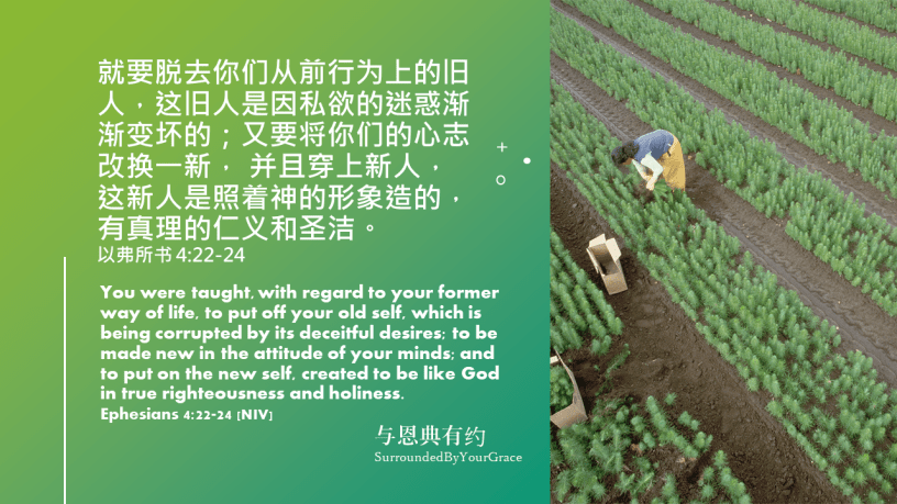 就要脱去你们从前行为上的旧人,这旧人是因私欲的迷惑渐渐变坏的;又要将你们的心志改换一新, 并且穿上新人,这新人是照着神的形象造的,有真理的仁义和圣洁。以弗所书 4:22-24