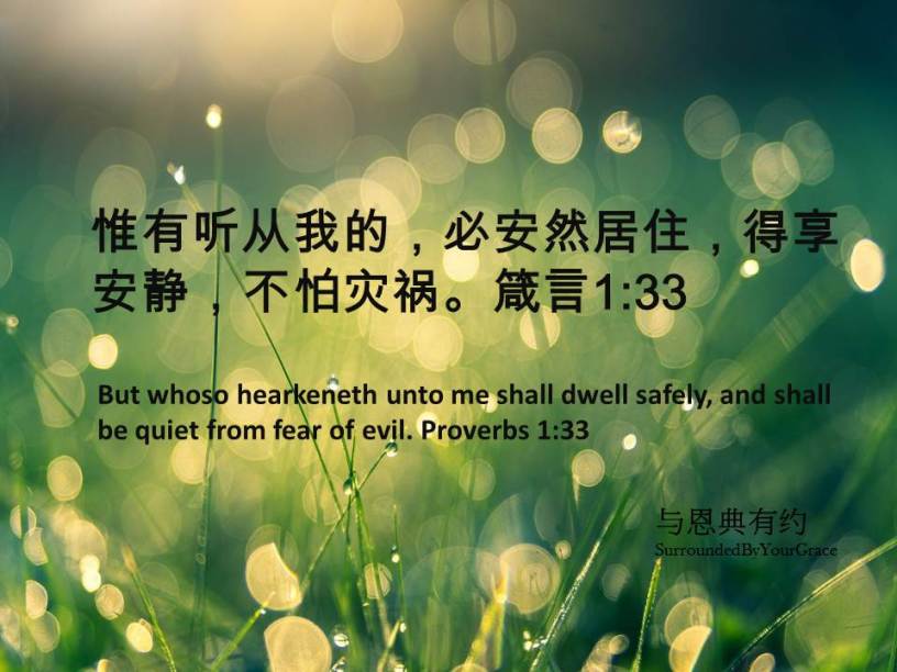 箴言, 平安 箴言1:33 Date: 02/19/2022Author: tingfong123 惟有听从我的,必安然居住,得享安静,不怕灾祸。箴言1:33 But whoso hearkeneth unto me shall dwell safely, and shall be quiet from fear of evil. Proverbs 1:33 亲爱天父,祢是我们的避难所,是我们的倚靠,是我们唯一的盼望。我只要全心全意信靠祢,仰望祢,在祢的荫庇下,必然安穏居住。感谢祢听我们的祈祷,祷告奉主耶稣基督胜名求,阿们。 Share this: Share on X (Opens in new window) X Share on Facebook (Opens in new window) Facebook Share on Pinterest (Opens in new window) Pinterest Share on WhatsApp (Opens in new window) WhatsApp Share on Telegram (Opens in new window) Telegram Like Loading... Related