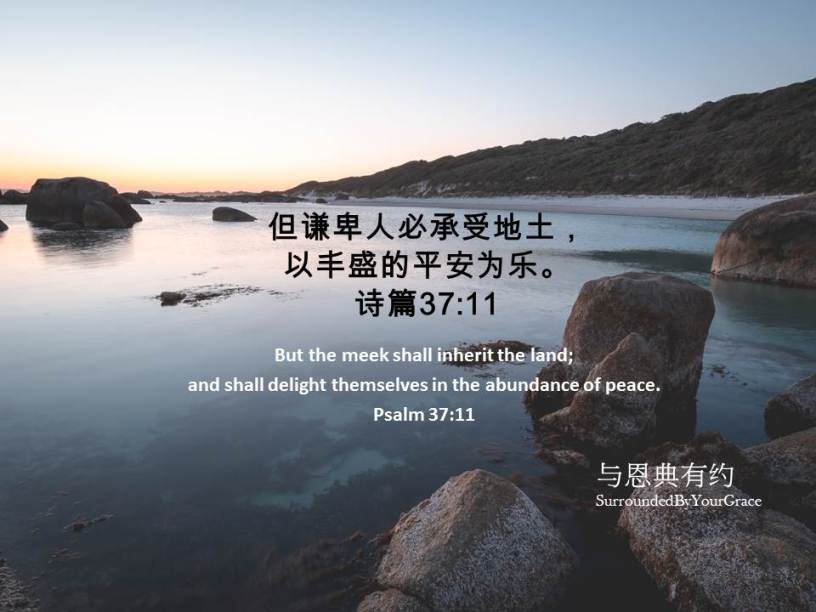 诗篇, 谦卑, 平安 诗篇37:11 Date: 04/27/2022Author: tingfong123 但谦卑人必承受地土,以丰盛的平安为乐。诗篇37:11 But the meek shall inherit the land; and shall delight themselves in the abundance of peace. Psalm 37:11 亲爱天父,我们谦卑的来到祢面前,为要敬拜祢。我们素来听从祢的命令,祢就赐下平安如河水,祢所赐出人意外的平安,必保守我们的心怀意念。感谢祢听我们的祈祷,祷告奉主耶稣基督胜名求,阿们。 Share this: Share on X (Opens in new window) X Share on Facebook (Opens in new window) Facebook Share on Pinterest (Opens in new window) Pinterest Share on WhatsApp (Opens in new window) WhatsApp Share on Telegram (Opens in new window) Telegram Like Loading... Related