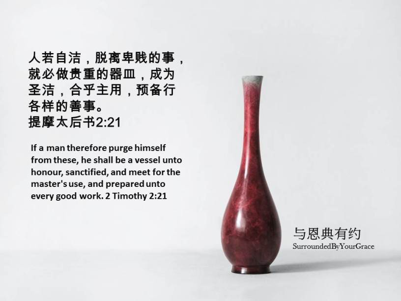 人若自洁,脱离卑贱的事,就必做贵重的器皿,成为圣洁,合乎主用,预备行各样的善事。提摩太后书2:21
