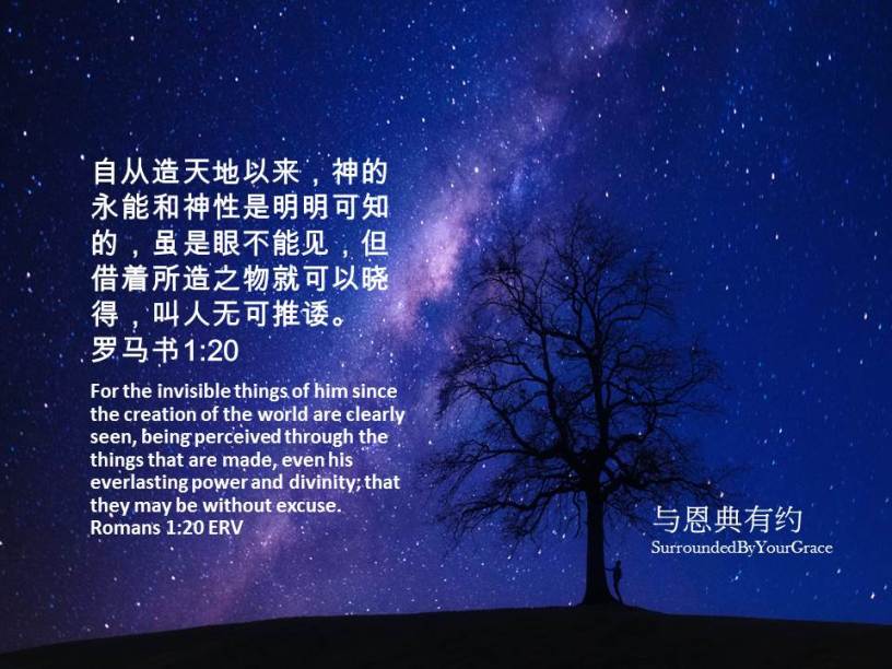 自从造天地以来,神的永能和神性是明明可知的,虽是眼不能见,但借着所造之物就可以晓得,叫人无可推诿。罗马书1:20