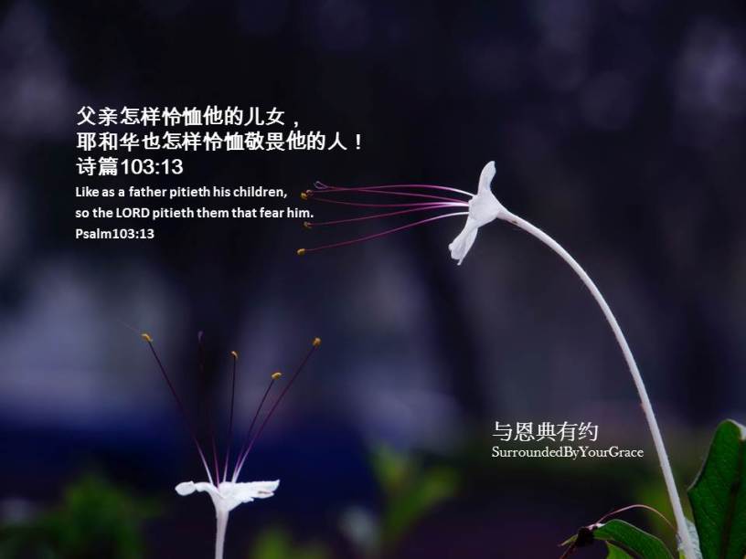 诗篇, 怜恤 诗篇103:13 Date: 06/04/2022Author: tingfong123 父亲怎样怜恤他的儿女,耶和华也怎样怜恤敬畏他的人!诗篇103:13 Like as a father pitieth his children, so the LORD pitieth them that fear him. Psalm 103:13 亲爱天父,祢是我们在天上的父亲,祢无时无刻的看顾着我们,也常常的细心照料我们,我们实在很感谢祢。求主祢施恩怜恤我们,也赦免我们的过犯,因为我们敬畏祢。感谢祢听我们的祈祷,祷告奉主耶稣基督圣名求,阿们。 Share this: Share on X (Opens in new window) X Share on Facebook (Opens in new window) Facebook Share on Pinterest (Opens in new window) Pinterest Share on WhatsApp (Opens in new window) WhatsApp Share on Telegram (Opens in new window) Telegram Like Loading... Related