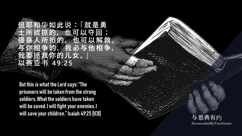 但耶和华如此说:「就是勇士所掳掠的,也可以夺回;强暴人所抢的,也可以解救。与你相争的,我必与他相争,我要拯救你的儿女。」以赛亚书 49:25