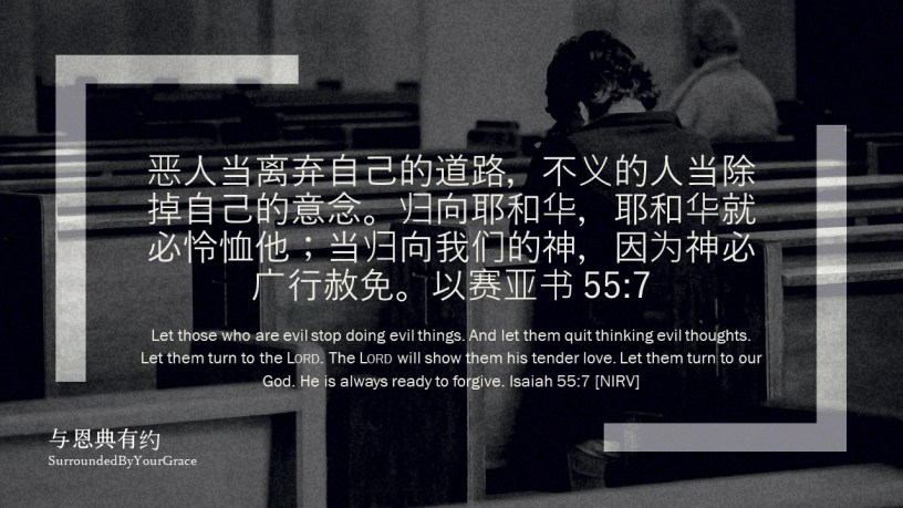 恶人当离弃自己的道路,不义的人当除掉自己的意念。归向耶和华,耶和华就必怜恤他;当归向我们的神,因为神必广行赦免。以赛亚书 55:7