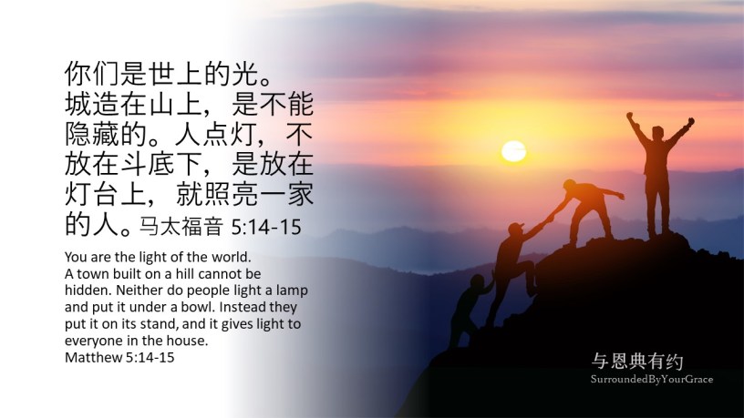 你们是世上的光。城造在山上,是不能隐藏的。 人点灯,不放在斗底下,是放在灯台上,就照亮一家的人。马太福音 5:14-15