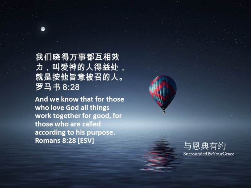 亲爱天父,谢谢祢赐下应许,叫我们爱神的人得益处,叫万事都互相效力,所以我们知道每一件事都有它的原因,也有祢的许可,求主叫我们在每件事上都能够忍耐等候,直等到主的旨意成就。感谢祢听我们的祈祷,祷告奉主耶稣基督圣名求,阿们。