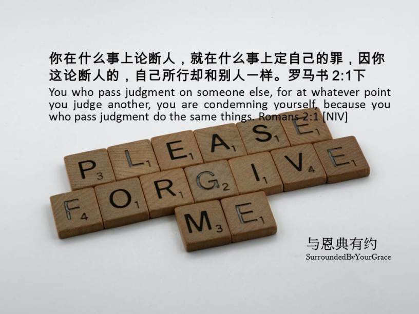 亲爱天父,我们知道很多时我们看见别人有过犯的时候,便会批评论断别人,却忘记了自己也有一些短处,是主所寛容怜悯的,求主叫我们能够寛宏待人,就像主寛容我们一样。感谢祢听我们的祈祷,祷告奉主耶稣基督圣名求,阿们。
