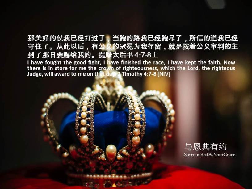 那美好的仗我已经打过了,当跑的路我已经跑尽了,所信的道我已经守住了。从此以后,有公义的冠冕为我存留,就是按着公义审判的主到了那日要赐给我的。提摩太后书 4:7-8上