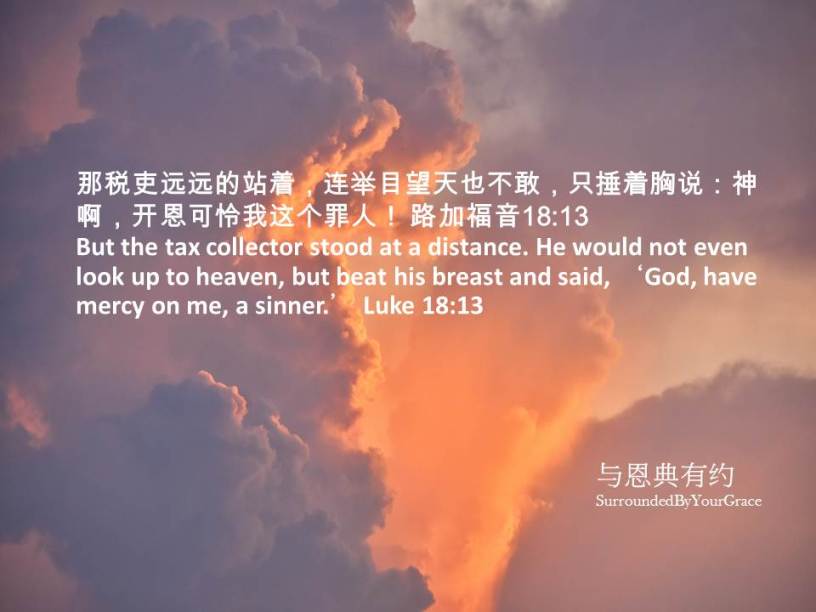 那税吏远远的站着,连举目望天也不敢,只捶着胸说:神啊,开恩可怜我这个罪人!路加福音18:13