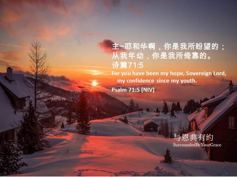 盼望, 诗篇, 依靠 诗篇 71:5 Date: 01/21/2023Author: tingfong123 主─耶和华啊,你是我所盼望的;从我年幼,你是我所倚靠的。诗篇 71:5 For you have been my hope, Sovereign Lord, my confidence since my youth. Psalm 71:5 [NIV] 亲爱天父,在这农历的新一年,求主祝福我们,保守我们,叫我们有平安喜乐,因为我们倚靠祢。感谢祢听我们的祈祷,祷告奉主耶稣基督圣名求,阿们。 Share this: Share on X (Opens in new window) X Share on Facebook (Opens in new window) Facebook Share on Pinterest (Opens in new window) Pinterest Share on WhatsApp (Opens in new window) WhatsApp Share on Telegram (Opens in new window) Telegram Like Loading... Related