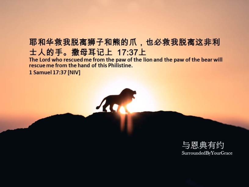 耶和华救我脱离狮子和熊的爪,也必救我脱离这非利士人的手。撒母耳记上 17:37上