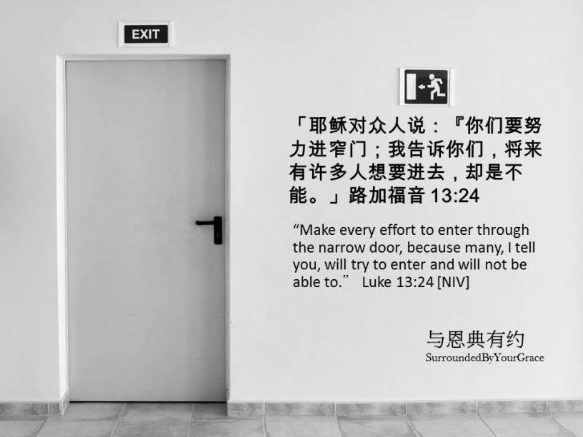 「耶稣对众人说:『你们要努力进窄门;我告诉你们,将来有许多人想要进去,却是不能。」路加福音 13:24