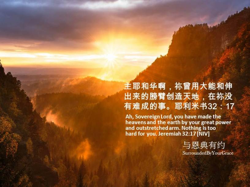 主耶和华啊,祢曾用大能和伸出来的膀臂创造天地,在祢没有难成的事。 耶利米书32:17